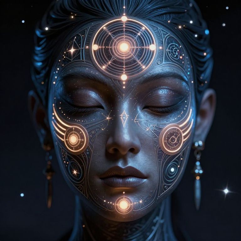 A highly detailed, intricately designed face adorned with glowing accents and cosmic symbols, set against a dark, starry background, exuding a sense of sacred geometry and alien technology.