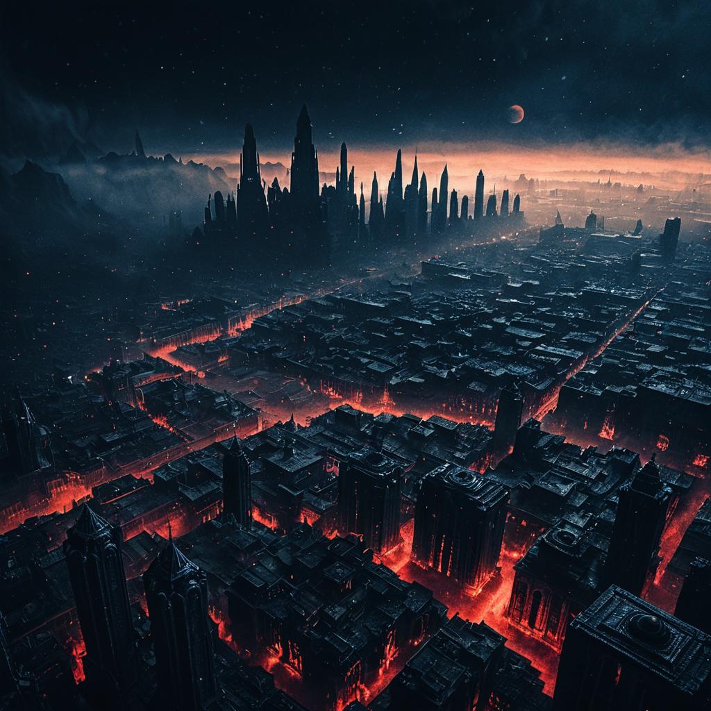 A cinematic digital illustration depicting a colossal icy exoplanet glowing with electric blue auroras. The foreground shows a lone figure standing amidst sharp, jagged mountain silhouettes under a misty, noir atmosphere. Multiple moons orbit the main planet, set against a star-studded sky with shooting stars and swirling nebulae. Inspired by high-contrast chiaroscuro style and modern art deco elements.