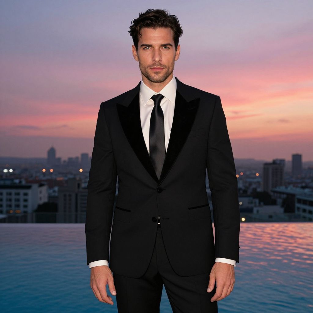 A man, classic black tuxedo, luxurious velvet lapel, ivory silk shirt, black silk tie, slim-fit black trousers, rooftop pool, city skyline view, vibrant sunset hues, confident expression, pinhole camera style. Man has masculine face and piercing eyes