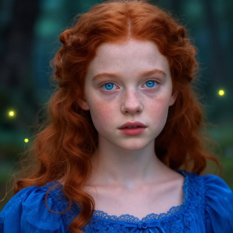 A photographically realistic digital illustration of a young woman with fair skin and striking blue eyes. She has long, wavy red hair styled with two braids on either side of her head. Her freckled face is framed by her hair, and she wears a blue, lace-trimmed dress with puffed sleeves. The background is blurred, featuring dark, out-of-focus foliage with scattered, glowing yellow lights, creating a magical, ethereal atmosphere. The woman's expression is neutral, and her gaze is direct, engaging the viewer.