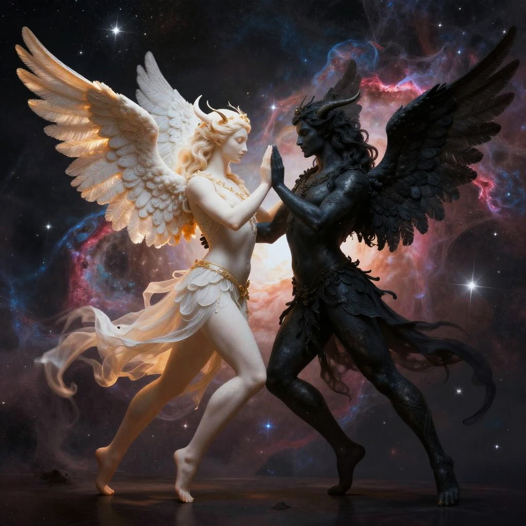 Opostas embodied by two mythical creatures locked in elegant dance, one radiant and angelic, the other dark and shadowy, set against cosmic backdrop with vibrant nebulae and stars, rich detail, expressive poses suggesting harmony in opposition.