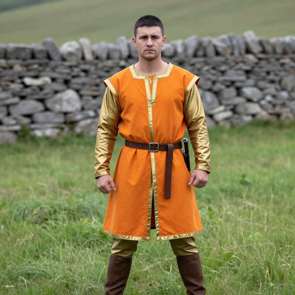 Photograph of a Caucasian man with short dark hair and a serious expression, standing in a grassy field. He wears an orange medieval-style tunic with gold sleeves and a brown belt, and brown pants. A black sheath with a knife is visible on his right side. The background features a stone wall and green rolling hills. The man's attire and the natural setting suggest a historical or fantasy theme. The bright colors of his tunic contrast with the muted green and grey of the background.