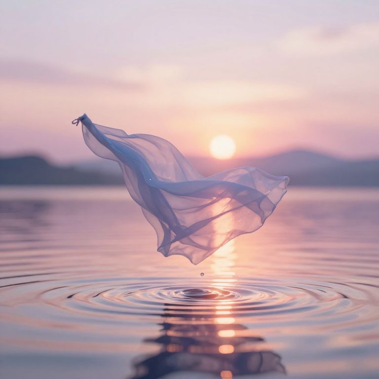Mizumizuni floating above a calm lake at sunset, ripples reflecting the sky, gentle wind blowing hair and fabric, dreamlike and serene, with glowing water effects and pastel hues, soft-focus background, fantasy realism, detailed texture.