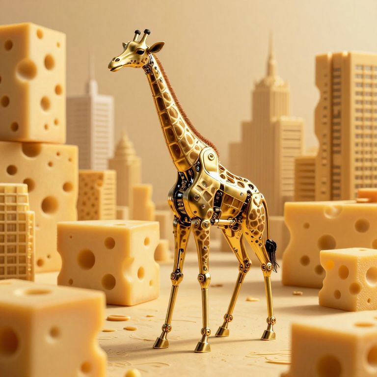Brass-limbed, clockwork giraffe strides through a surreal cityscape constructed entirely of golden, porous cheese blocks, its mechanical form casting intricate shadows as it navigates the whimsical urban terrain.