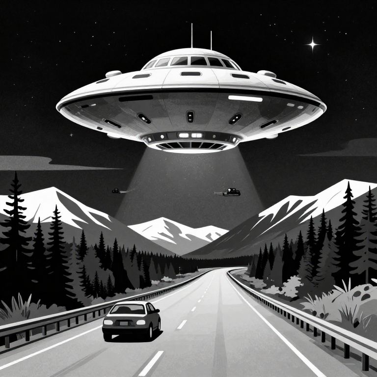 A black and white illustration of a UFO hovering over an Alaskan highway at night, with a car driving on the road and mountains in the background.