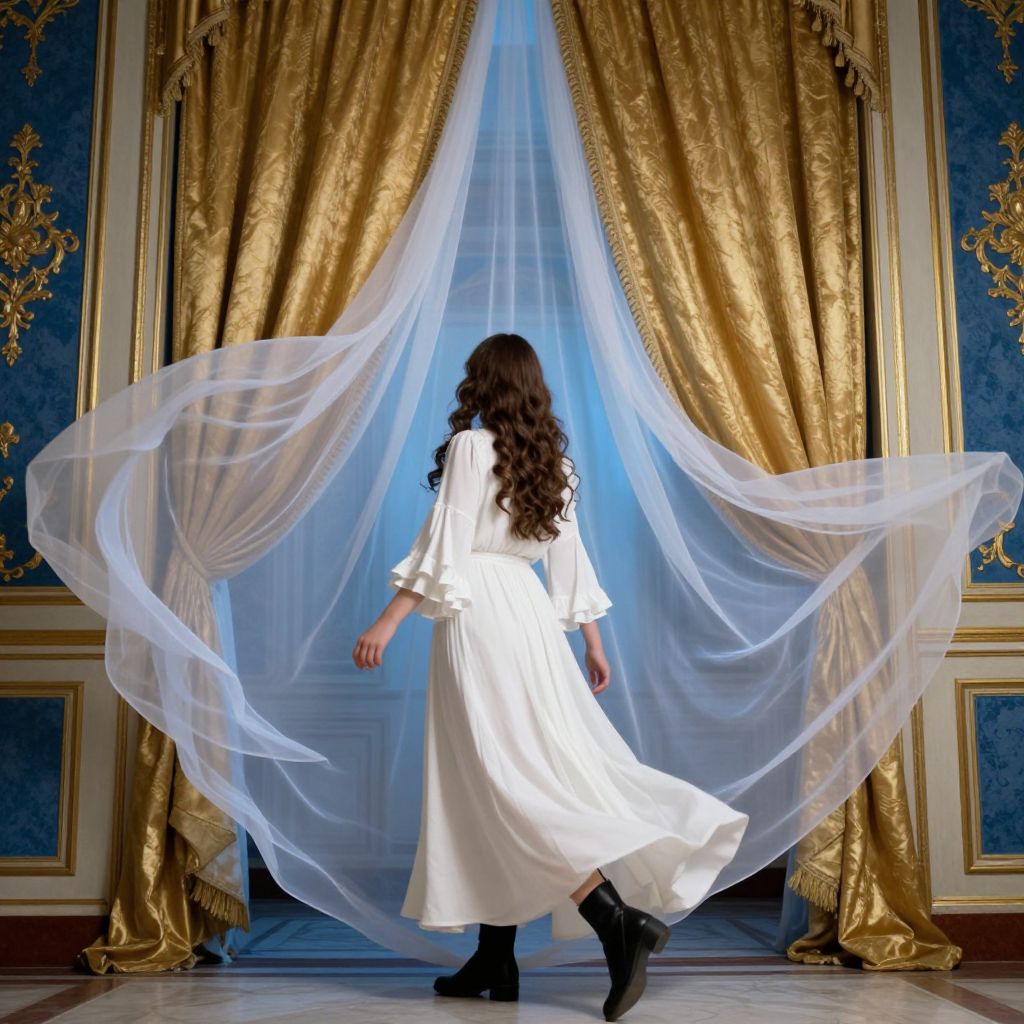 In this ethereal scene, a woman in a flowing, white dress with ruffled sleeves and black boots is gracefully walking through a large, ethereal veil that billows around her, creating a sense of movement and transition. The veil, a blend of white and light blue, is draped over a golden, heavy curtain that frames the doorway, adding a sense of grandeur and mystique to the setting. The walls are adorned with intricate, gold-trimmed blue wallpaper, enhancing the opulence of the environment. The woman's hair, a rich, wavy brown, cascades down her back, complementing the fluidity of her dress and the veil. The overall composition, with the woman positioned centrally and the veil and curtain creating a dynamic interplay of light and shadow, evokes a sense of transition, possibly symbolizing a passage from life to death. The interplay of colors, textures, and shapes creates a harmonious and visually captivating scene.
