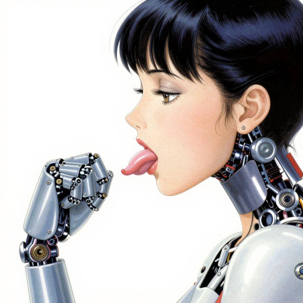 Digital art of a woman with black hair, cybernetic arm, and mechanical neck, licking her cybernetic finger, white background.