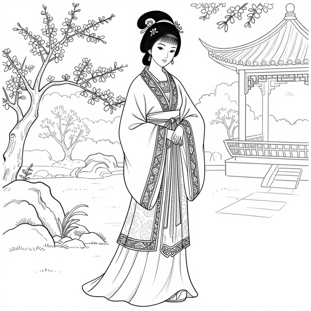 The image is a detailed black and white illustration of a beautiful Chinese woman from the 1800s, exuding grace and elegance. She is adorned in a intricately designed robe with elaborate patterns and textures, featuring long sleeves and a flowing skirt. The robe is complemented by a high-collared neckline and a sash tied around her waist. Her hair is styled in an elegant updo, adorned with decorative hairpins. In the background, there is a serene garden scene with blooming trees and a traditional Chinese pavilion, adding to the overall tranquility of the composition. The image is presented in a coloring page format, with the woman and the background elements clearly outlined for easy coloring. The overall composition is balanced, with the woman centrally positioned and the garden elements providing a harmonious backdrop.