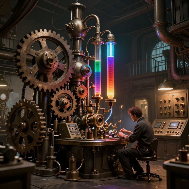Photograph of a dimly lit industrial laboratory featuring a man with curly brown hair, dressed in a dark suit and shirt, sitting at a round table surrounded by large metallic gears and pipes. Two multicolored neon tubes (blue, green, red) illuminate the background. The man is focused on a small device in front of him. The room has industrial-style control panels with numerous buttons and dials. The setting exudes a steampunk aesthetic with a mix of dark, metallic textures and vibrant, glowing elements. The background includes large windows with a grid pattern.