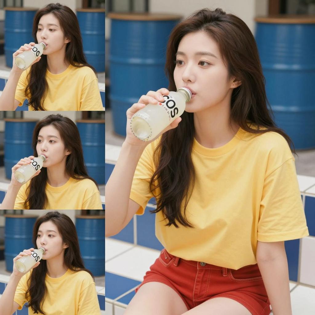 Asian woman with long dark brown hair, wearing a yellow T-shirt and red shorts, sitting on a blue and white tiled bench, drinking from a bottle. She has light skin and a neutral expression. Background includes multiple smaller images of her in similar attire, one with a "COS JAPAN" label. Blue barrel in the background. Bright, outdoor setting.