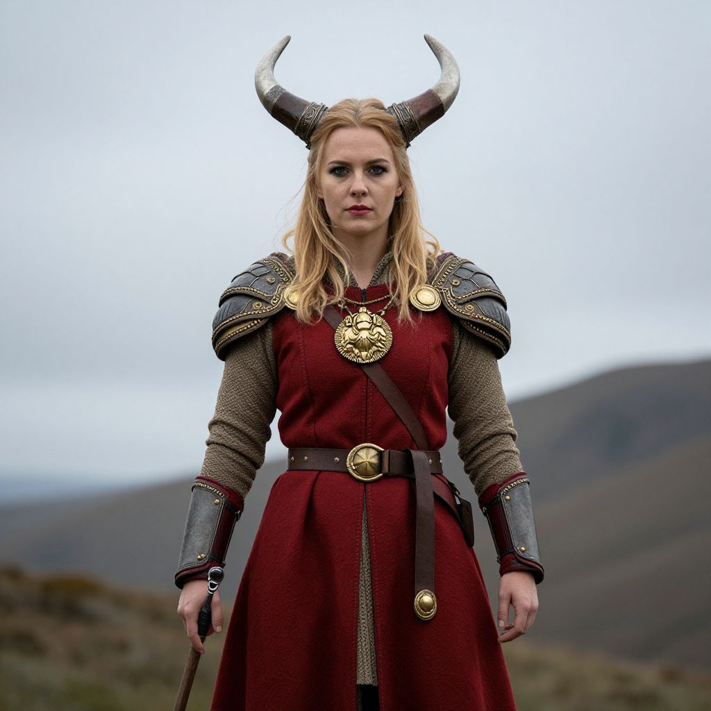 Photograph of a blonde woman with Viking horns, wearing a red dress, silver armor, and chainmail, standing in a mountainous landscape.
