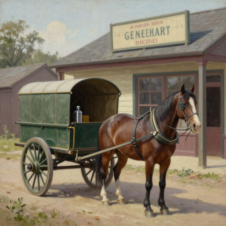 Photorealistic painting of a brown horse hitched to a green wagon, in front of "General Store & Dickey" building. Bright sunlight