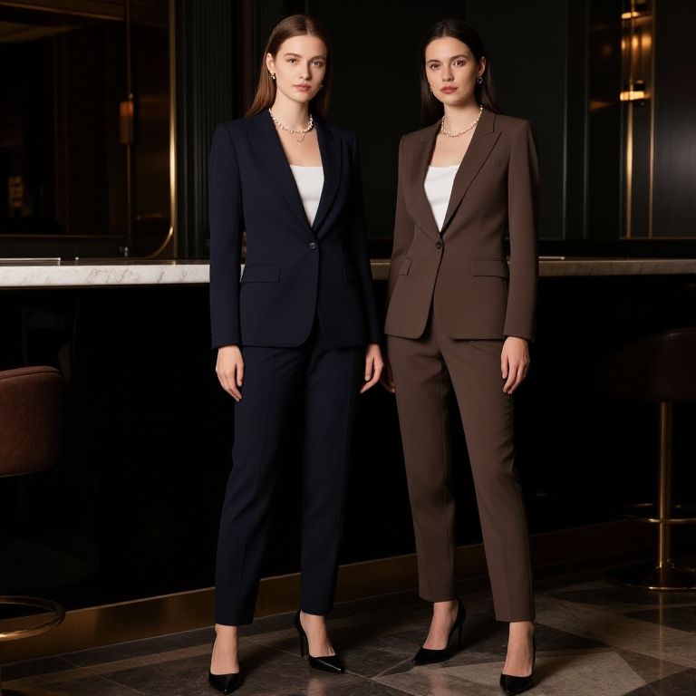 Photograph of two women standing side by side in a dimly lit room with a dark, modern aesthetic. Both women have straight, dark brown hair and are wearing tailored suits; the woman on the left wears a black suit with a white blouse, while the woman on the right wears a brown suit with a white blouse. They both have black high-heeled shoes and gold necklaces. Their expressions are neutral, and they stand with their hands by their sides. The background features a glossy, black countertop with subtle reflections and a dark, leather bar stool. The lighting is soft, highlighting their outfits.