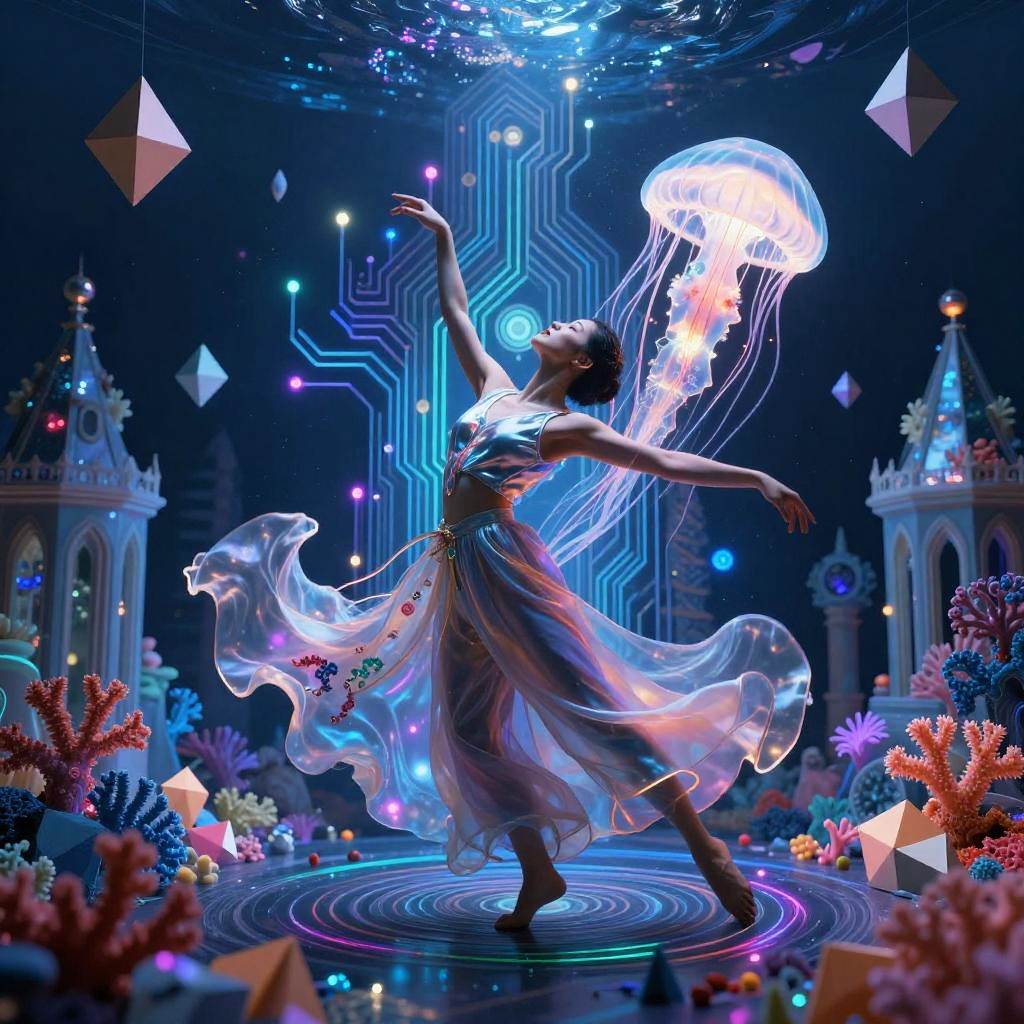 A bioluminescent jellyfish-headed dancer in a flowing silk suit on a psychedelic journey, witnessing herself unfurling into translucent circuitry woven with living coral, immersed in a cathedral of neon origami and fractal tidal currents. She merges with the water, experiencing unity with the universe, perceiving existence from countless viewpoints.