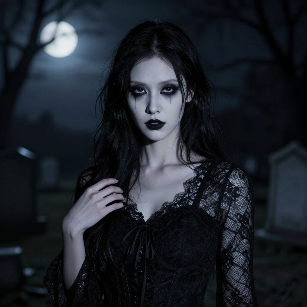 Goth transformation of a young woman, pale skin, dark dramatic makeup, black lace dress, smoky eyes, moody cemetery background, moonlit night, eerie atmosphere