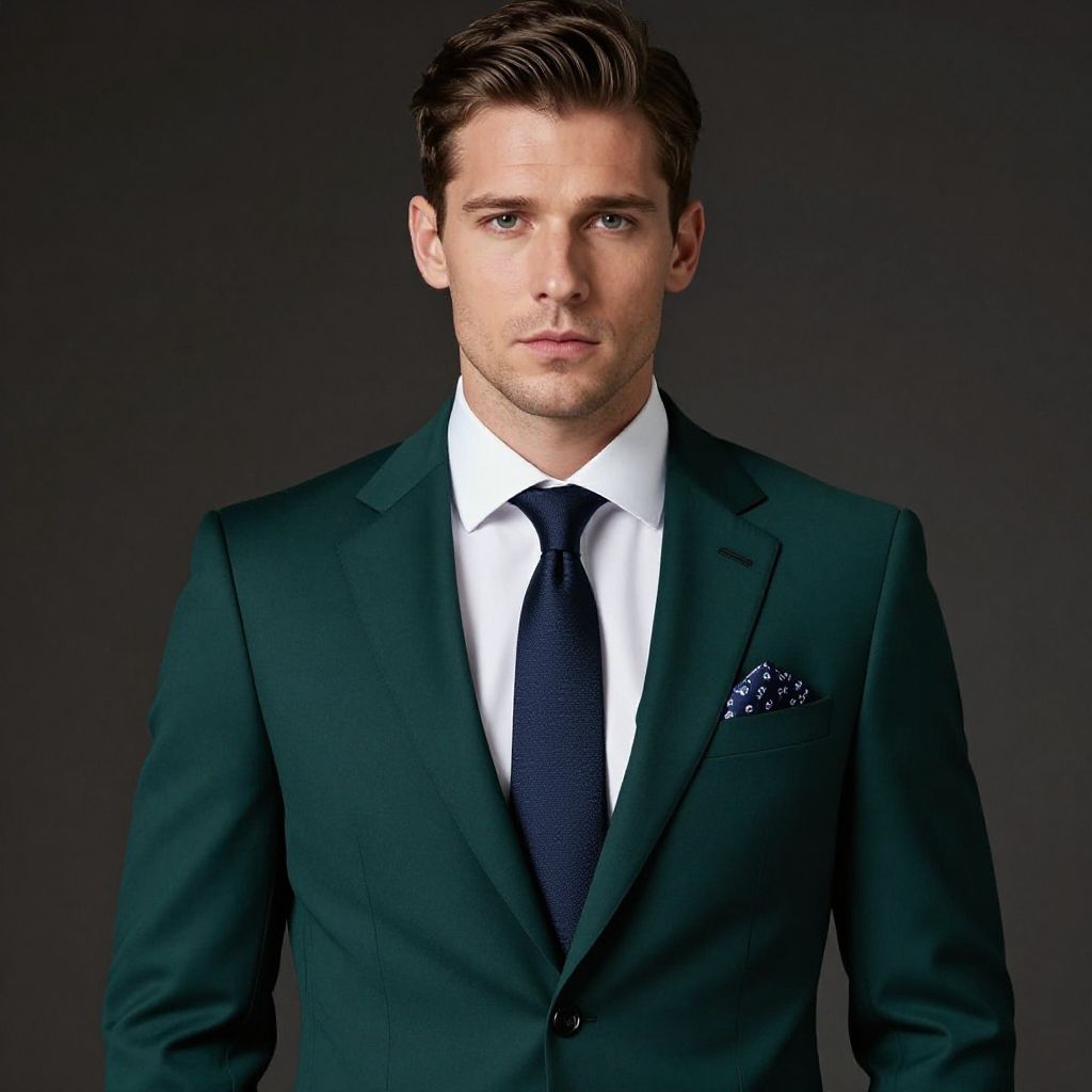 A handsome male model with smooth brown hair and bright blue eyes stands confidently in a natural outdoor setting, wearing a crisp green shirt with a subtle pattern and a well-fitted dark green jacket. The lighting is soft and golden, highlighting his features and the textures of the clothing. He has a relaxed yet polished expression, exuding calm confidence and modern elegance, with the background showing a gently sloped hillside and a clear blue sky with a few scattered clouds.