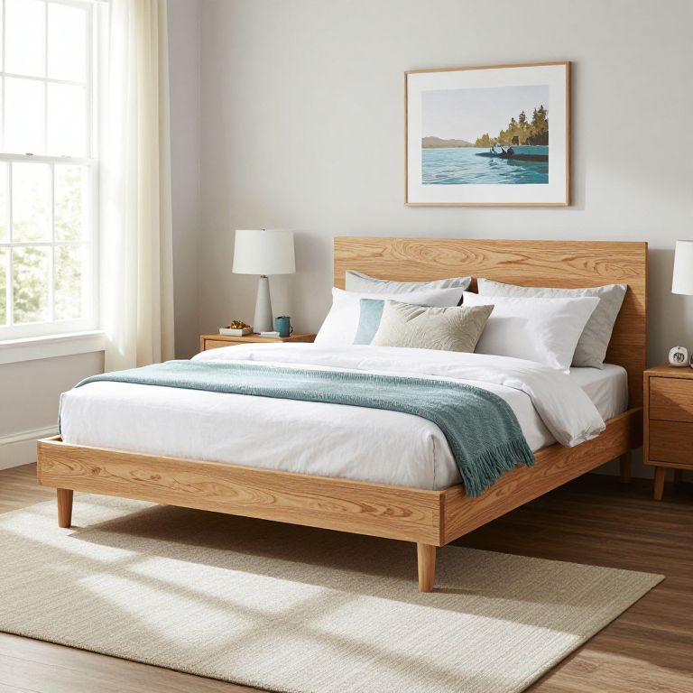 Photograph of a modern bedroom featuring a wooden bed with a natural wood grain finish, centered against a light gray wall. The bed is made with crisp white linens, including multiple pillows and a blue-green throw blanket. On either side of the bed are matching wooden nightstands with white lampshades. Above the bed hangs a framed landscape painting of a distant shoreline. The room has a large window on the left allowing natural light to flood in, casting soft shadows. A beige woven rug covers the dark wooden floor.