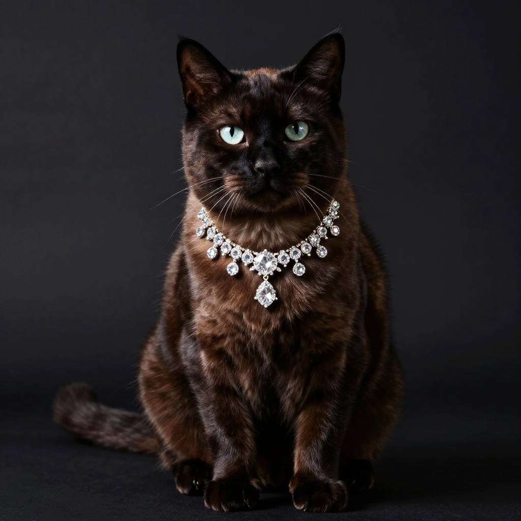 Studio portrait of a Turkish Van cat with glossy dark fur, sitting upright against a dark background. The cat is adorned with an ornate sparkling diamond necklace, showcasing high-end fashion pet photography in high resolution and ultra-detailed style.