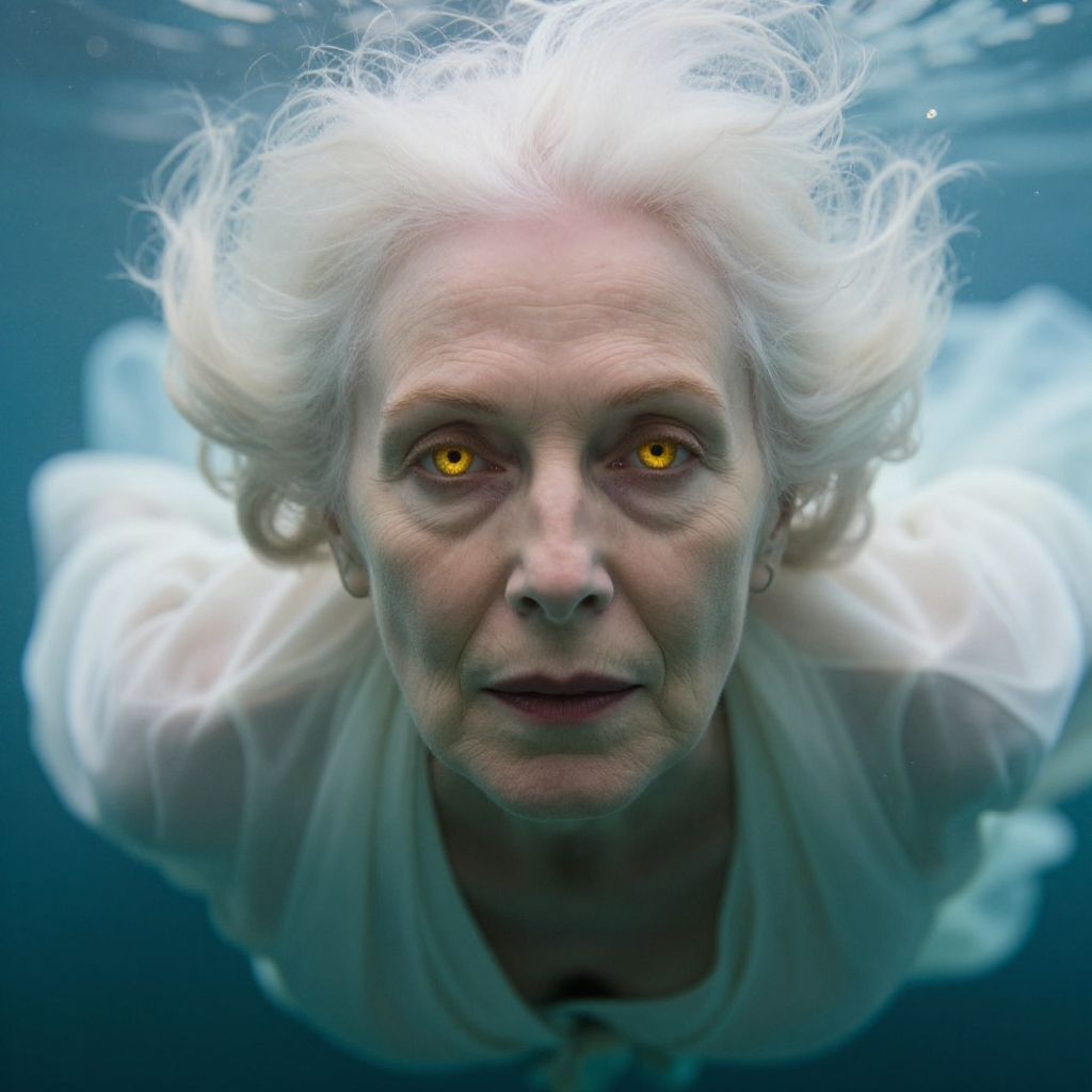 Photograph of an elderly woman with white hair and glowing yellow eyes underwater, wearing a translucent white garment, looking directly at the camera.