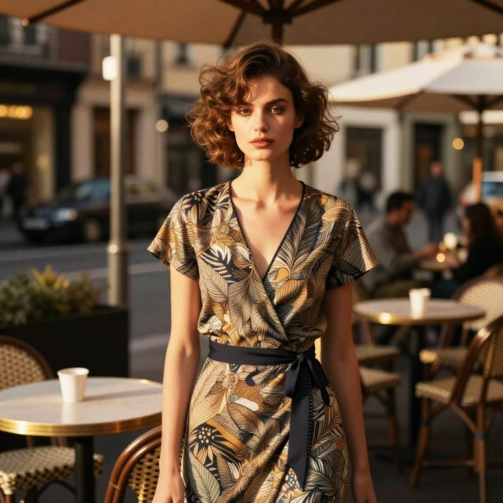 Bouffant hairstyle on fashion model, wearing chic silk blouse and tailored pants, in rooftop lounge, captured in fashion editorial style with sunset warm glow.