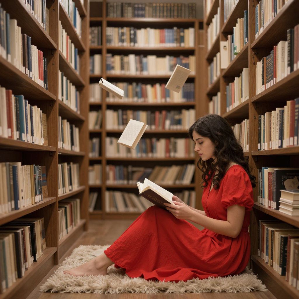 Books drift gracefully through the air above a serene library, where a woman in a vibrant red dress sits cross-legged on a soft rug, engrossed in reading amidst towering shelves filled with countless volumes.