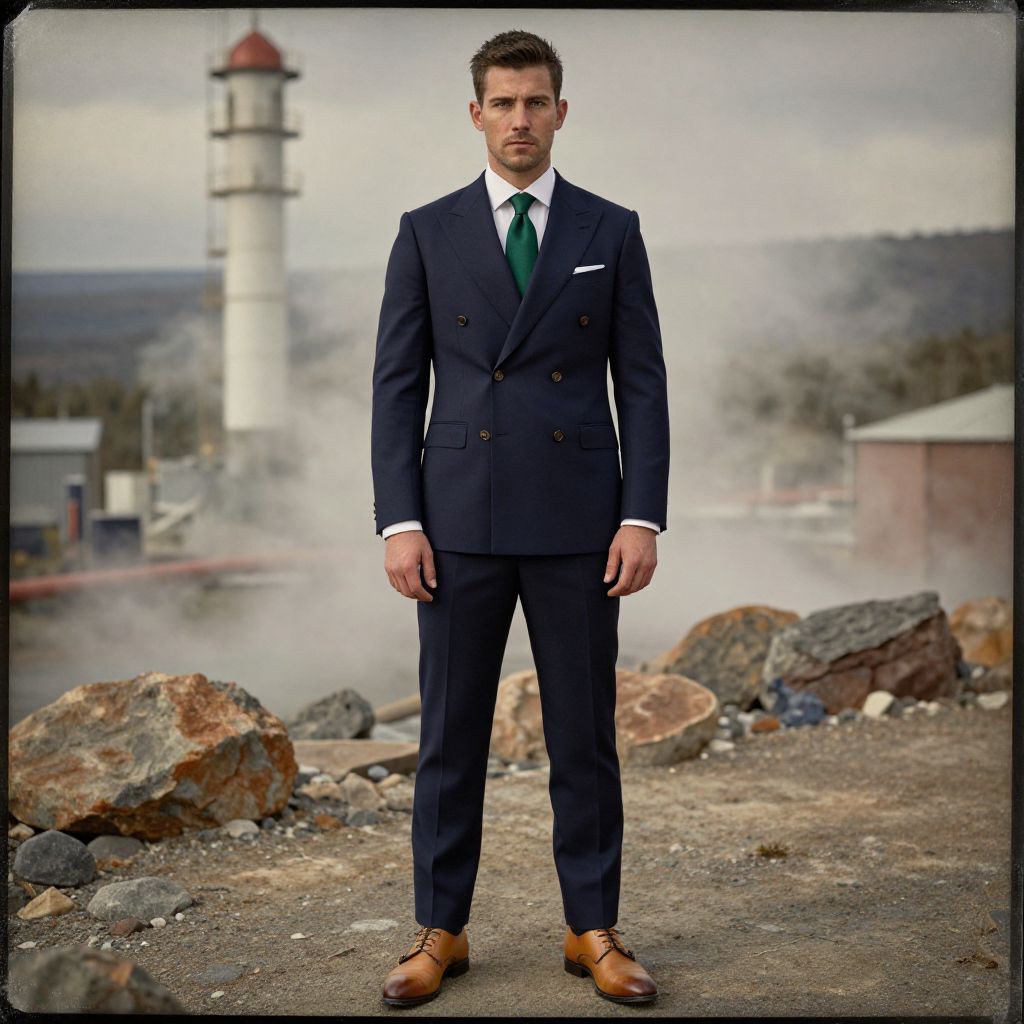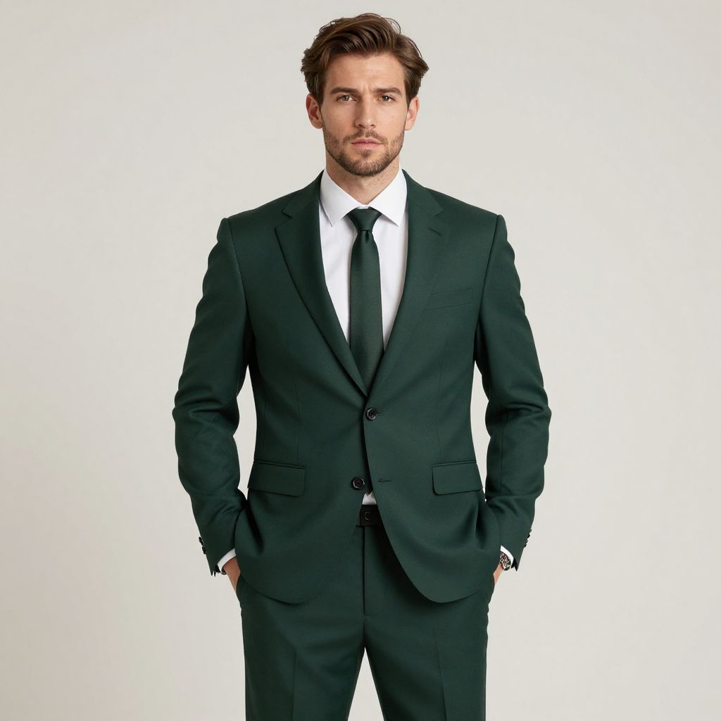 A man, deep forest green suit, ivory dress shirt, textured navy tie, black patent leather shoes, contrasting pocket square, modern glass buildings, calotype process, confident expression, soft focus, warm tones. Man has masculine face and piercing eyes