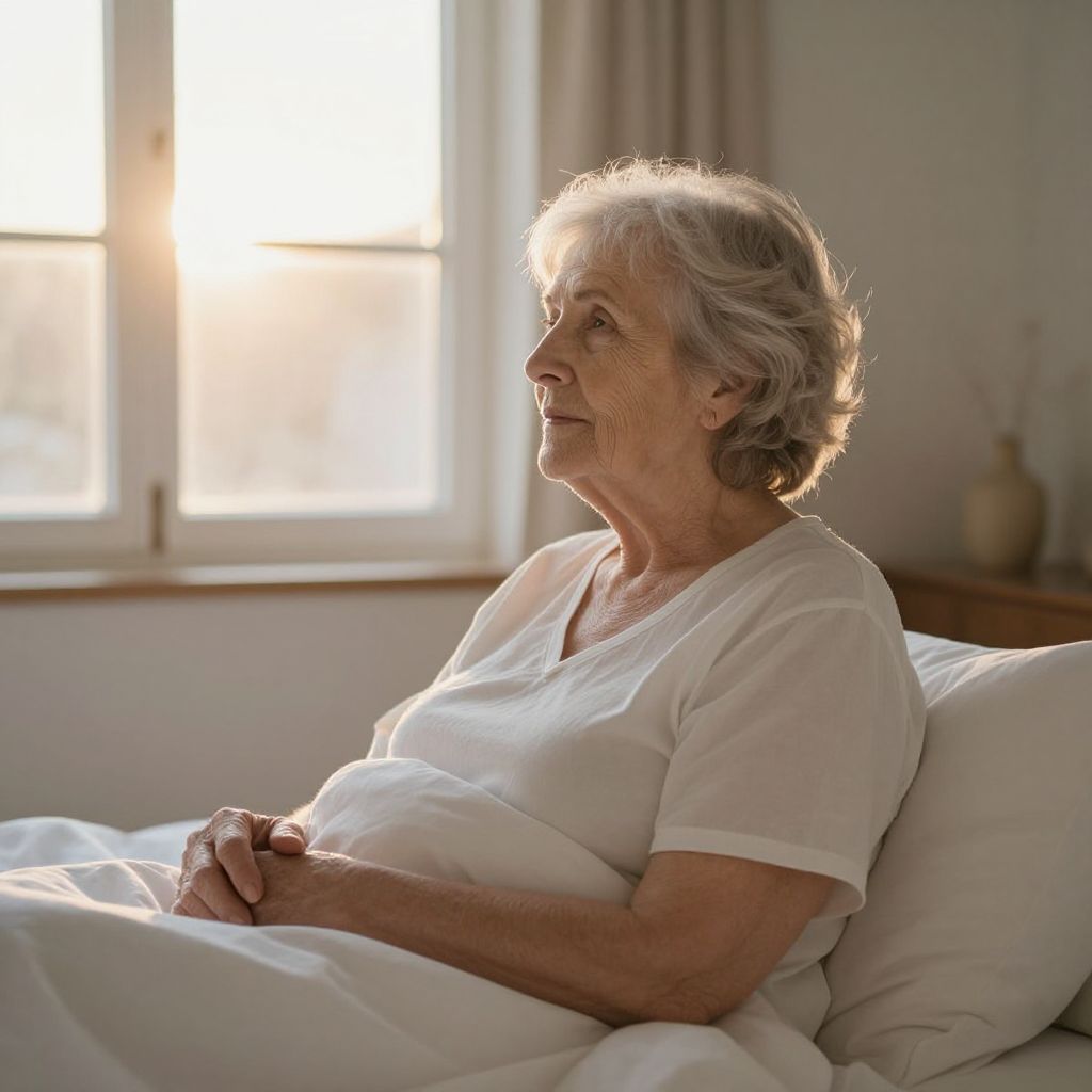 Awakening to a new dawn, the serene stretch of an elderly woman in soft, white bedding symbolizes renewal and the quiet strength of resilience, as the gentle hum of morning light and the warmth of her surroundings evoke a profound sense of peace and hope.