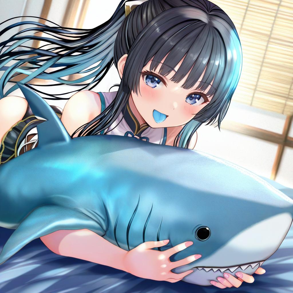 Artemis of the blue, atelier live, 1girl, shark girl, sharp teeth, blue tongue, black eyes, mole under eye, black hair, long hair, ponytail, blunt bangs, virtual youtuber, virtual youtuber, shark fin, by artist ogata tei, illustrious