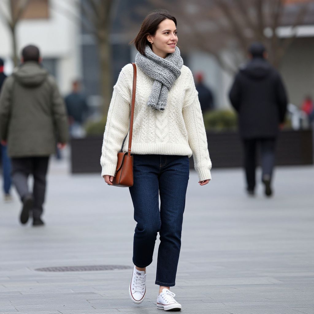 Smiling woman walking down a city street wearing a cream-colored cable knit sweater, dark blue jeans, white Converse sneakers, and a gray and white knit scarf, carrying a brown leather crossbody bag.