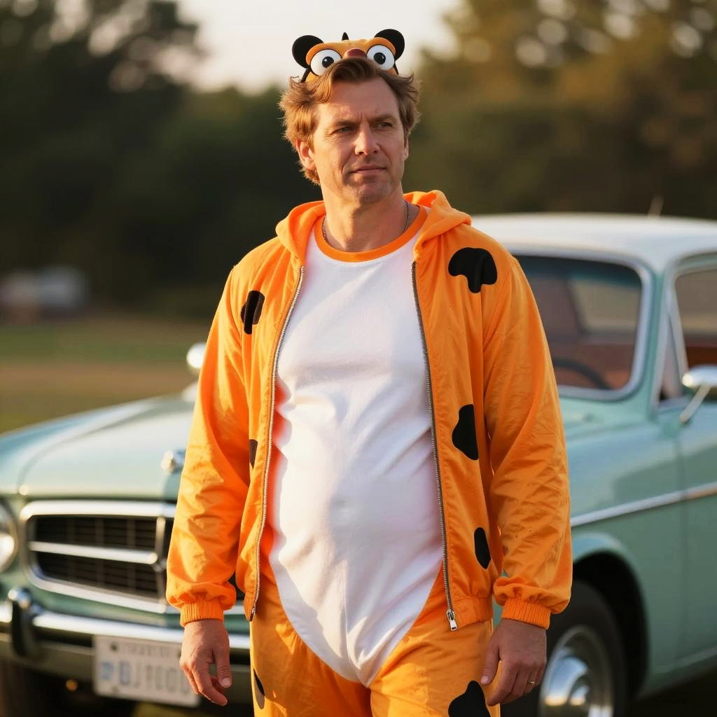 A man is dressed in a bright orange and white Fred Flintstone costume with black spots, standing outdoors during golden hour. The soft sunlight highlights the vivid colors of the outfit. Behind him is a vintage car styled to resemble the Flintstones' prehistoric vehicle, set against a blurred natural background.