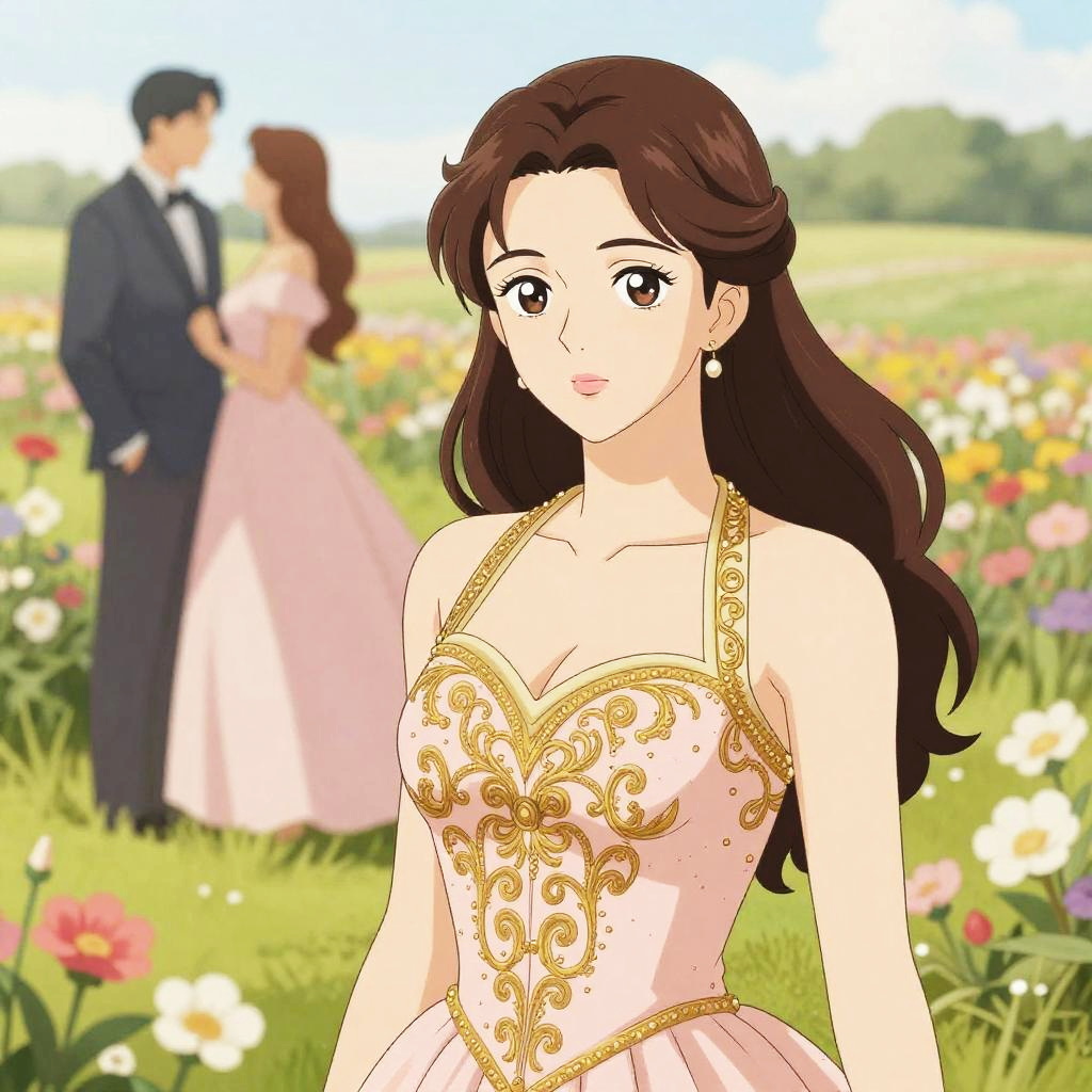 A Svelte woman in an elegant blush pink gown with a gold embroidered halter bodice, set against a backdrop of a romantic couple in a blooming flower field, illustrated in the style of Kodansha comics. Sexy. Pretty face and beutiful eyes