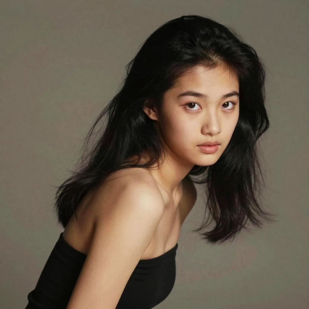 Film portrait photography, 1girl, bare shoulders, wavy shoulder-length hair, serene, calm, (realistic detailed eyes, natural skin texture, realistic face details), soft dramatic lighting, depth of field, bokeh, vibrant details, finely detailed, hyperrealistic, 35mm film, hazy blur, filmg