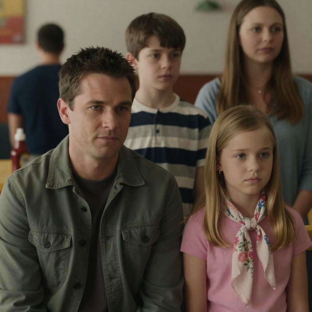 Photograph of two people on a gray couch. Adult man with short brown hair, gray t-shirt with blue graphic, blue jeans, and black watch, sitting with arms relaxed. Young boy with brown hair, brown sweater over white shirt, dark pants, eyes closed, arms crossed. Background includes wooden door, lamp, and blurred objects. Man's expression is serious, boy's expression is relaxed.