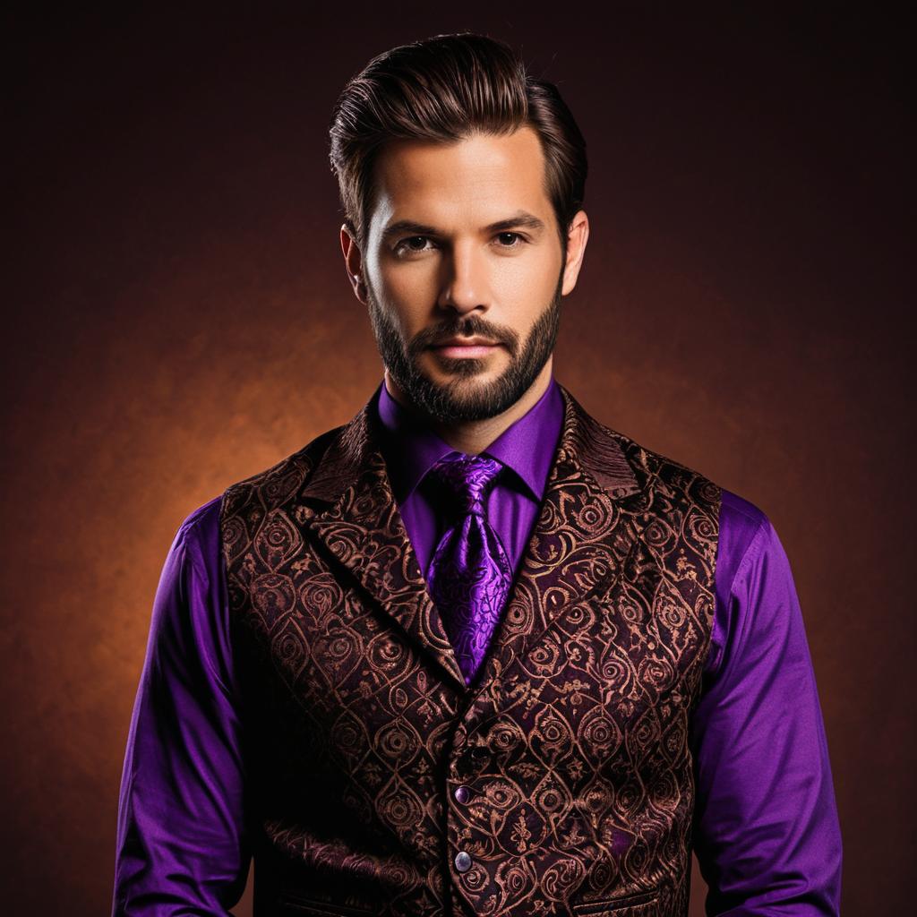 Photorealistic portrait of a handsome man with brown hair and a well-groomed beard. He is wearing a formal dark purple shirt with a matching purple tie and a brown vest featuring intricate patterns. The subject has a serious expression and a medium build, set against a gradient brown background with studio lighting.