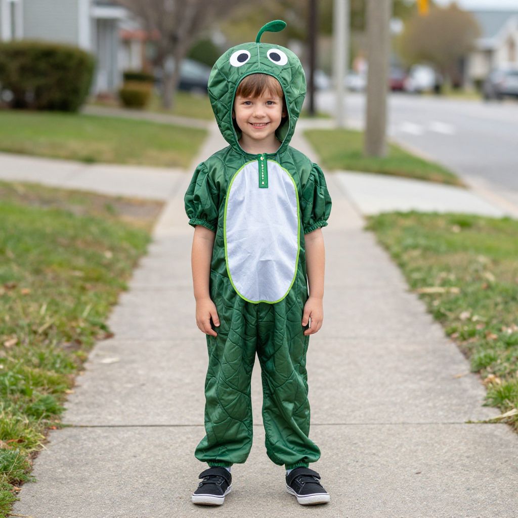 Spinach Can Kid Costume, child in a costume standing on a sidewalk