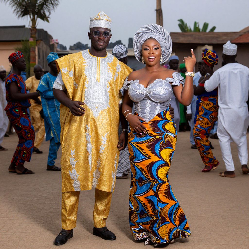 Photograph of a smiling Black couple standing in an outdoor, daytime setting. The man wears a shiny gold kaftan with silver accents and a matching hat, while the woman is in a silver off-shoulder top with a colorful, abstract-patterned skirt and a white headwrap. Both have dark skin. In the background, other people dressed in vibrant, patterned traditional attire are visible, including blue and white outfits. The background includes a palm tree and some buildings. The couple is positioned in the foreground, with the woman's right hand raised in a friendly gesture. The overall atmosphere is festive and cultural.