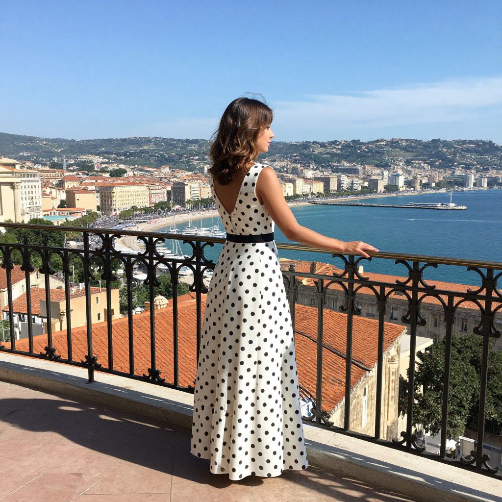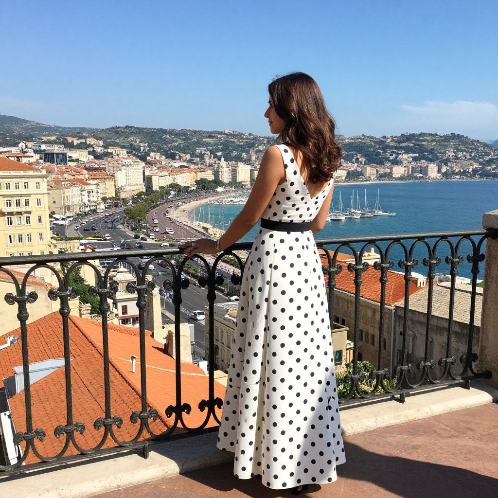 Woman in a polka-dotted gown stands gracefully on a sunlit balcony, her hand resting on an ornate wrought-iron railing as she gazes out over a vibrant coastal cityscape featuring sailboats, historic architecture, and distant hills under a clear blue sky.