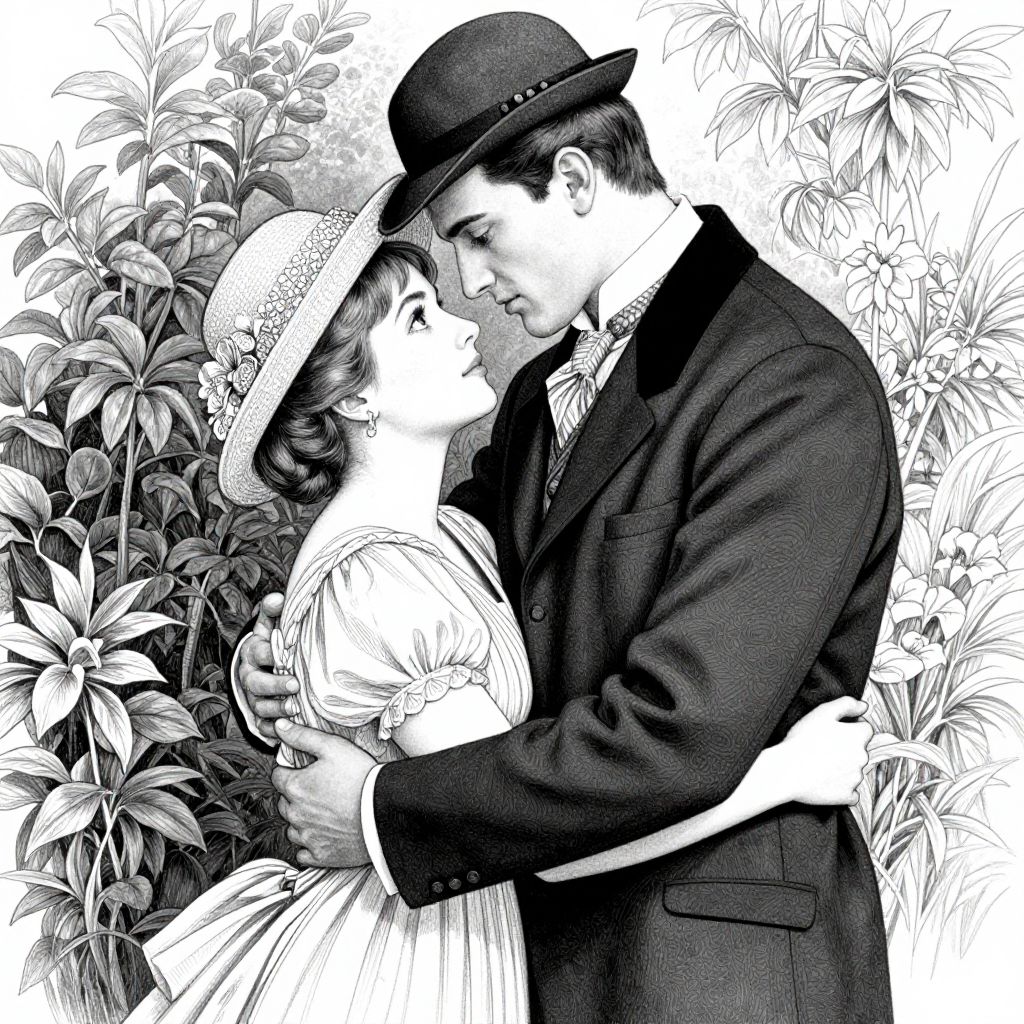 The image is a highly detailed, black-and-white illustration that captures a romantic embrace between a beautiful young woman and a tall, handsome young man. The woman, adorned with a delicate hat and a flowing dress, gazes into the man's eyes with a soft, contemplative expression. The man, wearing a crisp suit and hat, stands protectively behind her, his face partially obscured by the angle of the embrace. The background features lush, green foliage, adding a natural and serene atmosphere to the scene. The overall composition is reminiscent of the styles of Charles Dana Gibson, Walter M. Baumhofer, Norman Rockwell, Coles Phillips, and J.C. Leyendecker, with intricate details and polished, cinematic qualities. The image is designed for adult coloring pages, with a focus on the intricate clothing and textures, creating a visually rich and engaging scene.