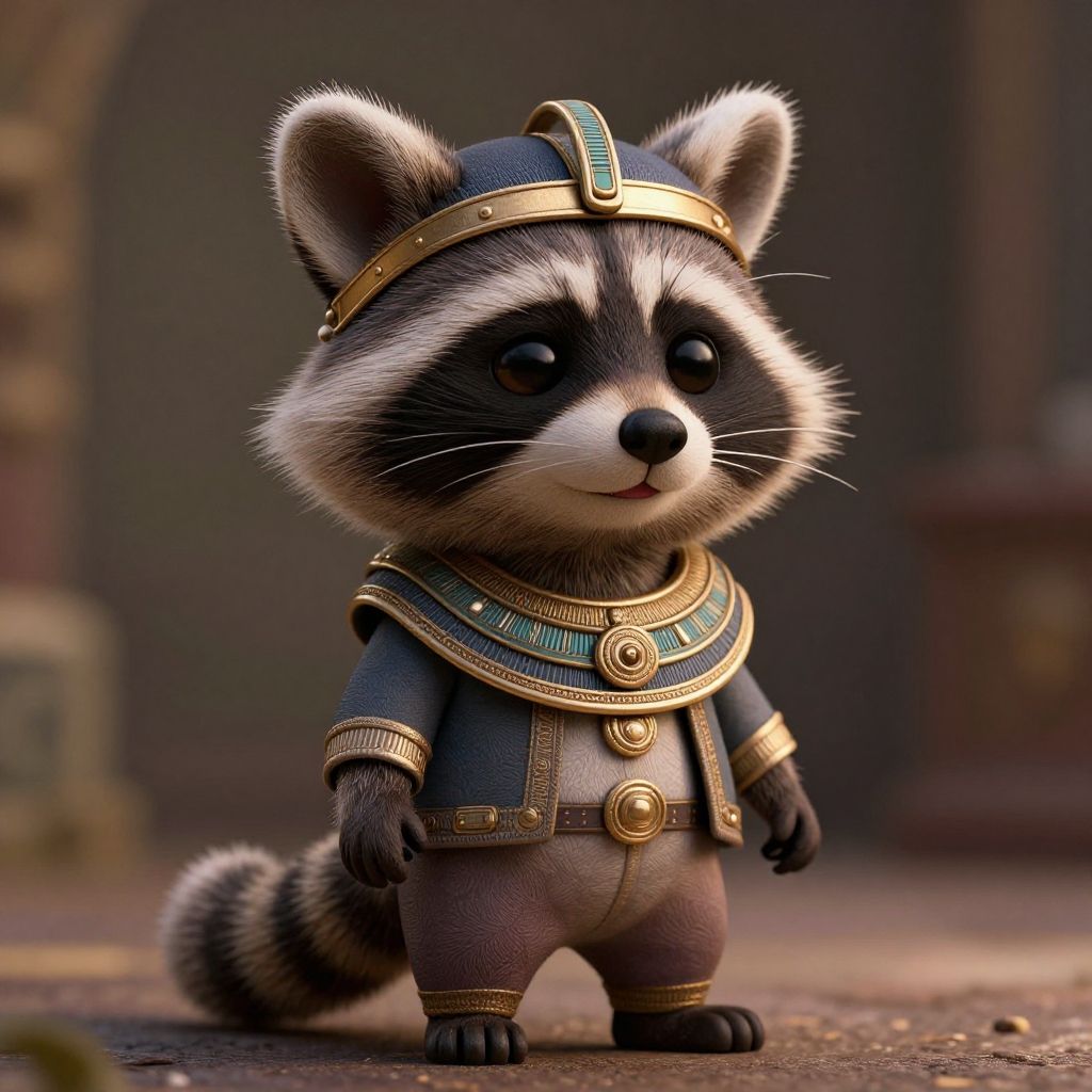 Photorealistic CGI image of an adorable, chubby raccoon wearing ancient Egyptian-inspired attire. The raccoon has large, black eyes and a small, black nose, with a fluffy, striped tail. It wears a blue, gold-trimmed headpiece, a matching blue tunic with gold accents, and a detailed, green and gold collar. The background is blurred, featuring dark, earthy tones and hints of ancient architecture. The raccoon stands on a textured, stone-like surface, with a soft, warm light illuminating its face and outfit, enhancing the detailed fur and fabric textures. The overall style is whimsical and charming.