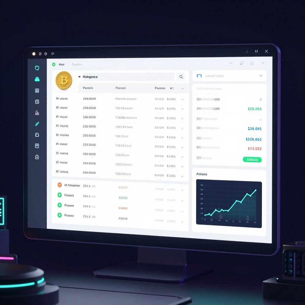 A fake crypto wallet screenshot portraying a desktop application window with detailed crypto portfolio stats, fake transaction confirmations, and animated charts, depicted in a cyberpunk-inspired color palette with glowing accents.