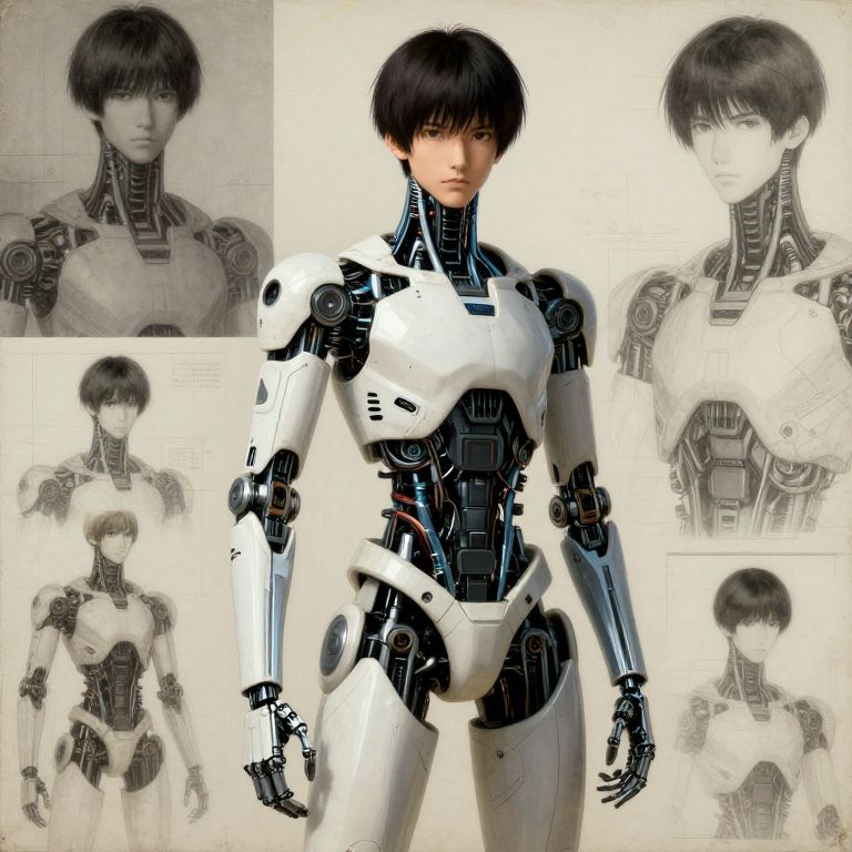Candid wide shot portrait of a young male japanese cyberpunk android with robot and cyborg parts, artwork by adolph menzel, ghost in the shell production design