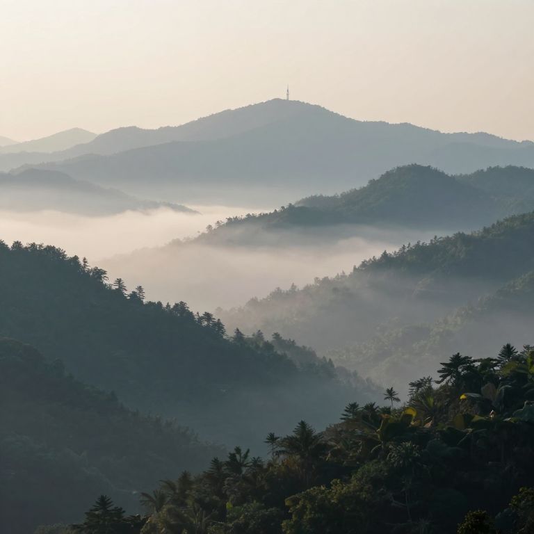 Photograph of a misty mountain landscape with layered, forested hills in deep green and blue hues, illuminated by soft morning light.