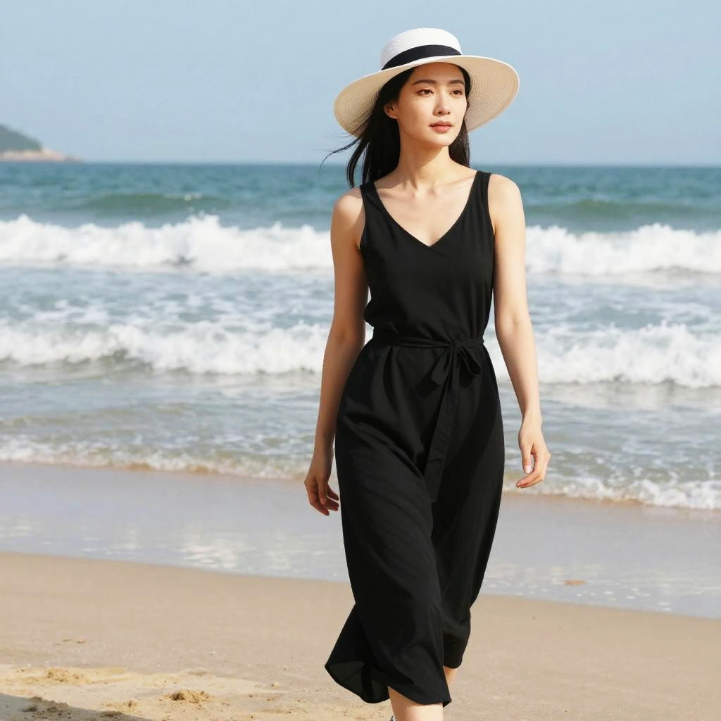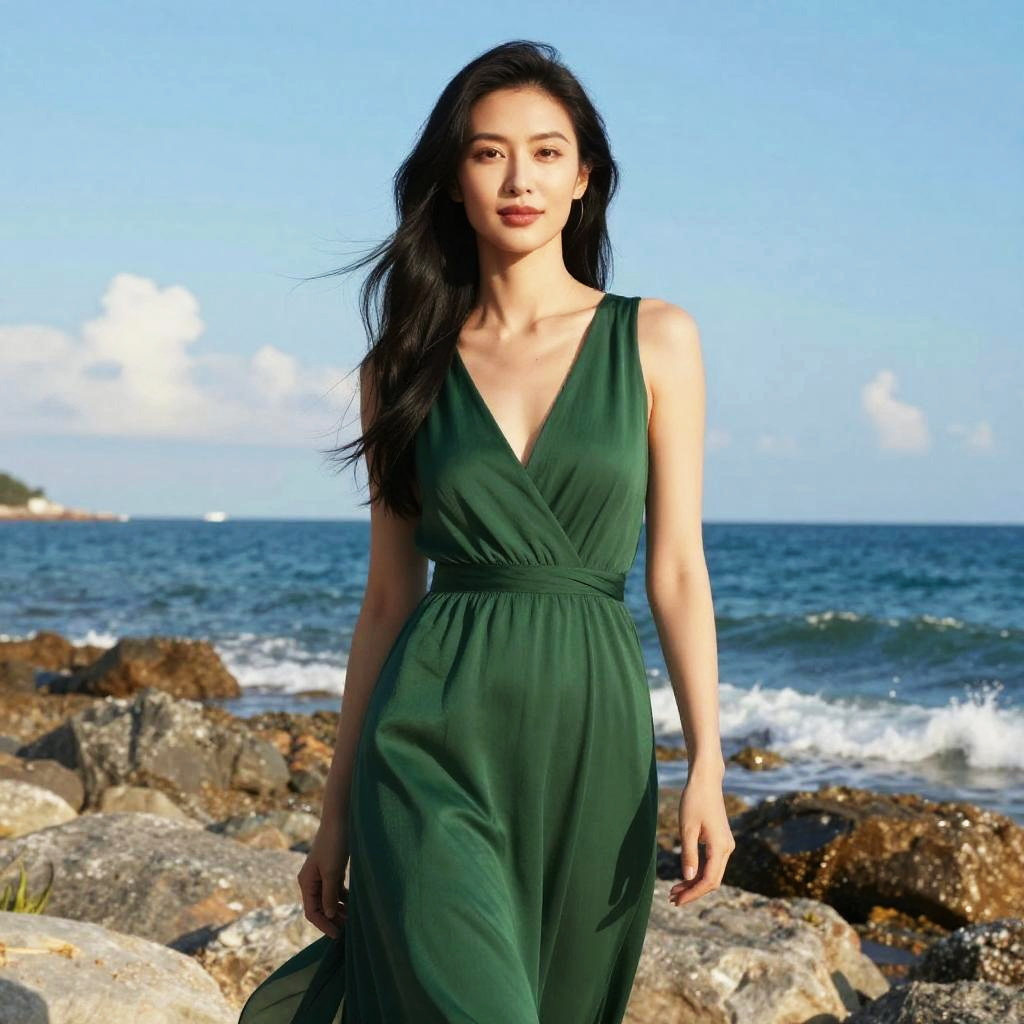 Young Asian woman with long black hair in gray tank top and shorts stands on a waterfront pier with ocean background.