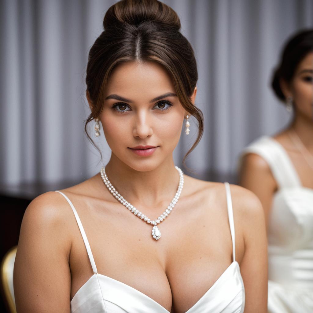 Low bun bridemaid,1girl, jewelry, solo, necklace, earrings, realistic, brown hair, dress, breasts, looking at viewer, blurry background, hair bun, blurry, cleavage, white dress, collarbone, upper body, lips