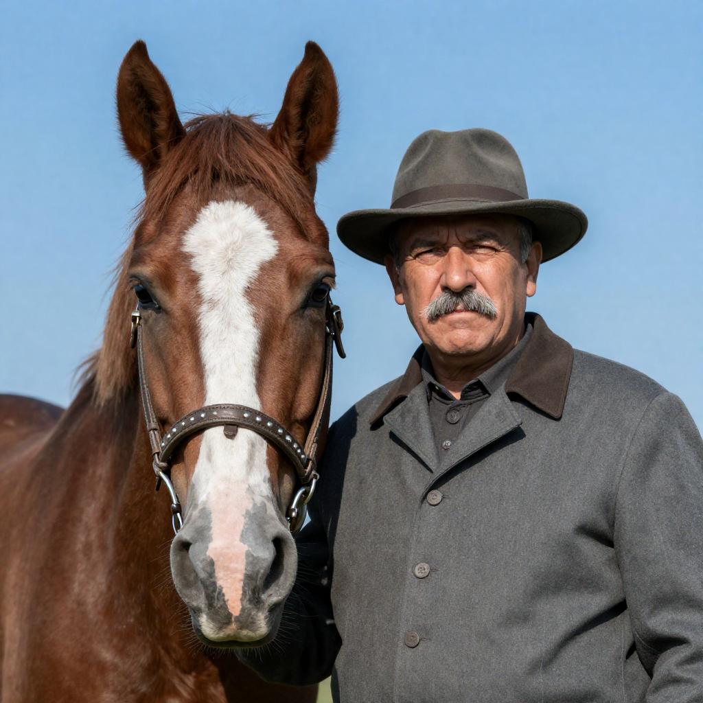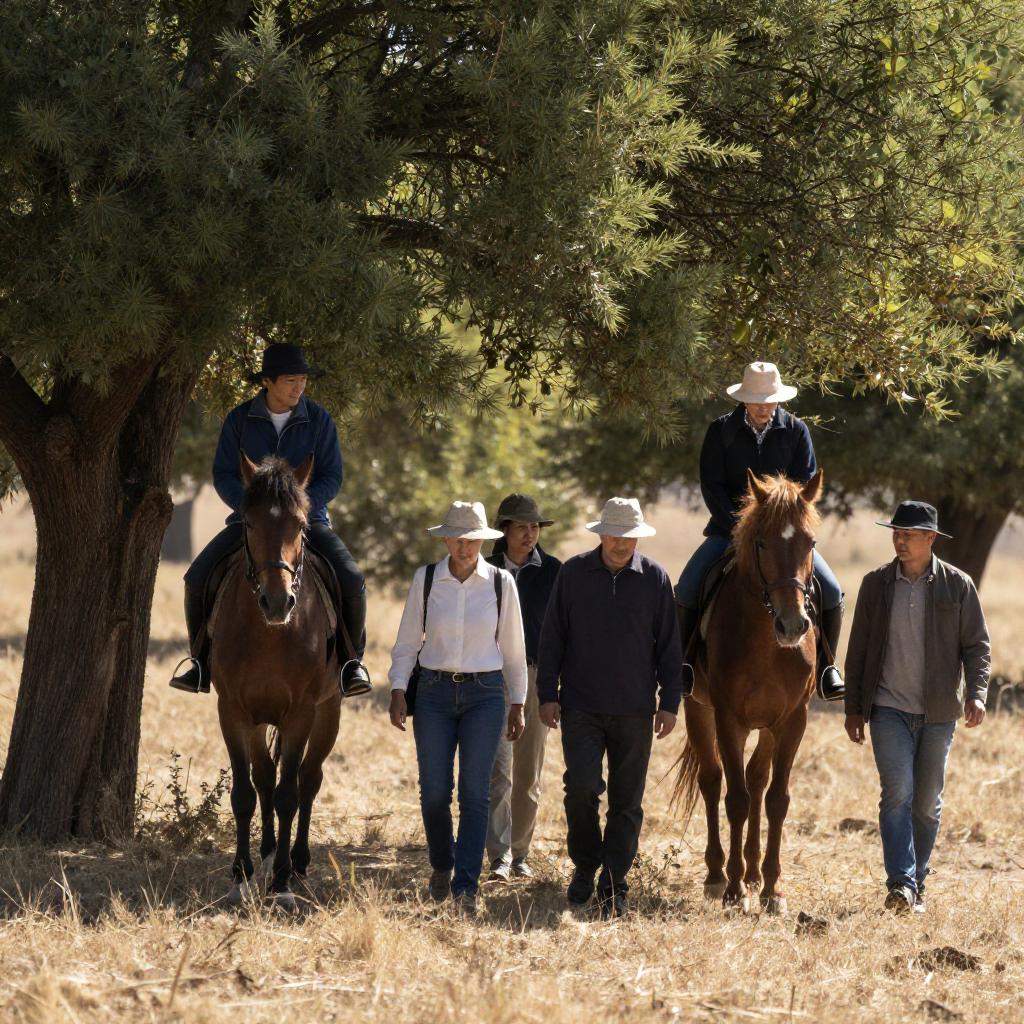 Photograph of a group of seven people walking alongside two brown horses under a large tree. People wear hats, jackets, and casual clothing. One person rides the left horse, another the right. Sunlight filters through leaves. Dry grass in foreground. Horses' heads lowered, people in relaxed stride. Intense sunlight on right side.