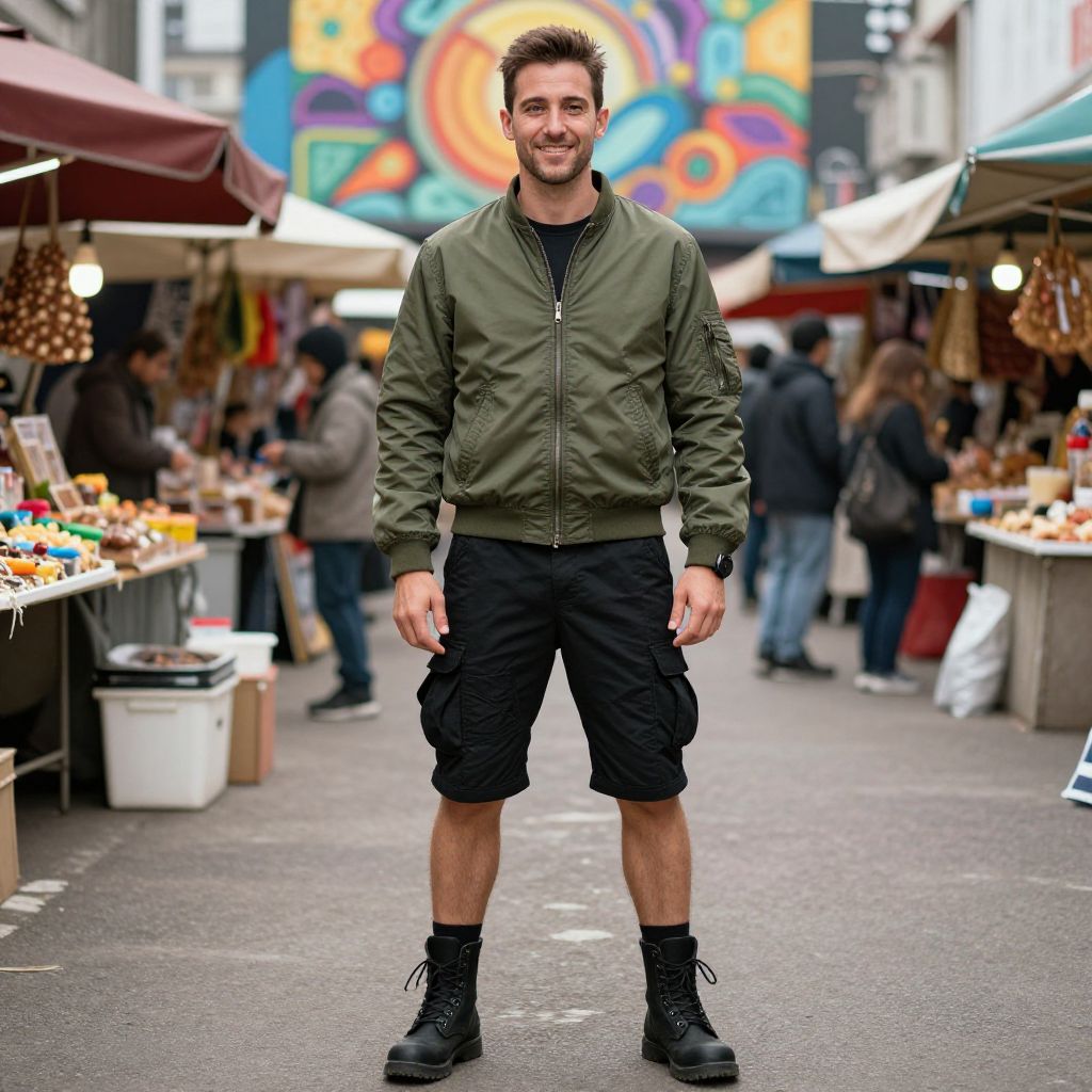 Photograph of a smiling, bearded man with short brown hair, wearing a blue denim vest over a light blue button-up shirt, olive green cargo pants, and black and white sneakers. He stands in a sunlit, outdoor urban area, surrounded by casually dressed people. In the background, there are white umbrellas, trees, and a brick building. The man's outfit and friendly demeanor contrast with the busy, lively street scene behind him. The image has a bright, vibrant color palette.