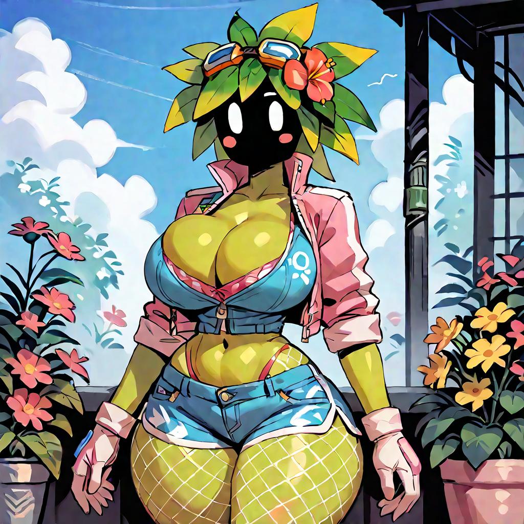 Score_9, score_8_up, score_7_up, score_6_up, score_5_up, score_4_up, source_furry, (by shq:1.15), kanna \(blaster master\), elemental creature, elemental humanoid, flora fauna, humanoid, plant humanoid, accessory, big breasts, blush, blush stickers, breasts, cleavage, cleavage overflow, clothed, clothing, female, floral, flower, flower \(anatomy\), flower accessory, flower hair accessory, flower pot, for a head, goggles, green body, green skin, hair accessory, handwear, head flower, jacket, leaf, leaf hair, non-mammal breasts, not furry, plant, plant hair, pseudo hair, solo, tight clothing, topwear, watermelon pattern, (simple eyes, simple face, looking at viewer:1.3), detailed background, outside, garden, looking at viewer, wide hips, huge hips, fishnet, fishnet topwear, rear view, tail, long tail, cow tail, open mouth, hand up, excited, happy, cheering