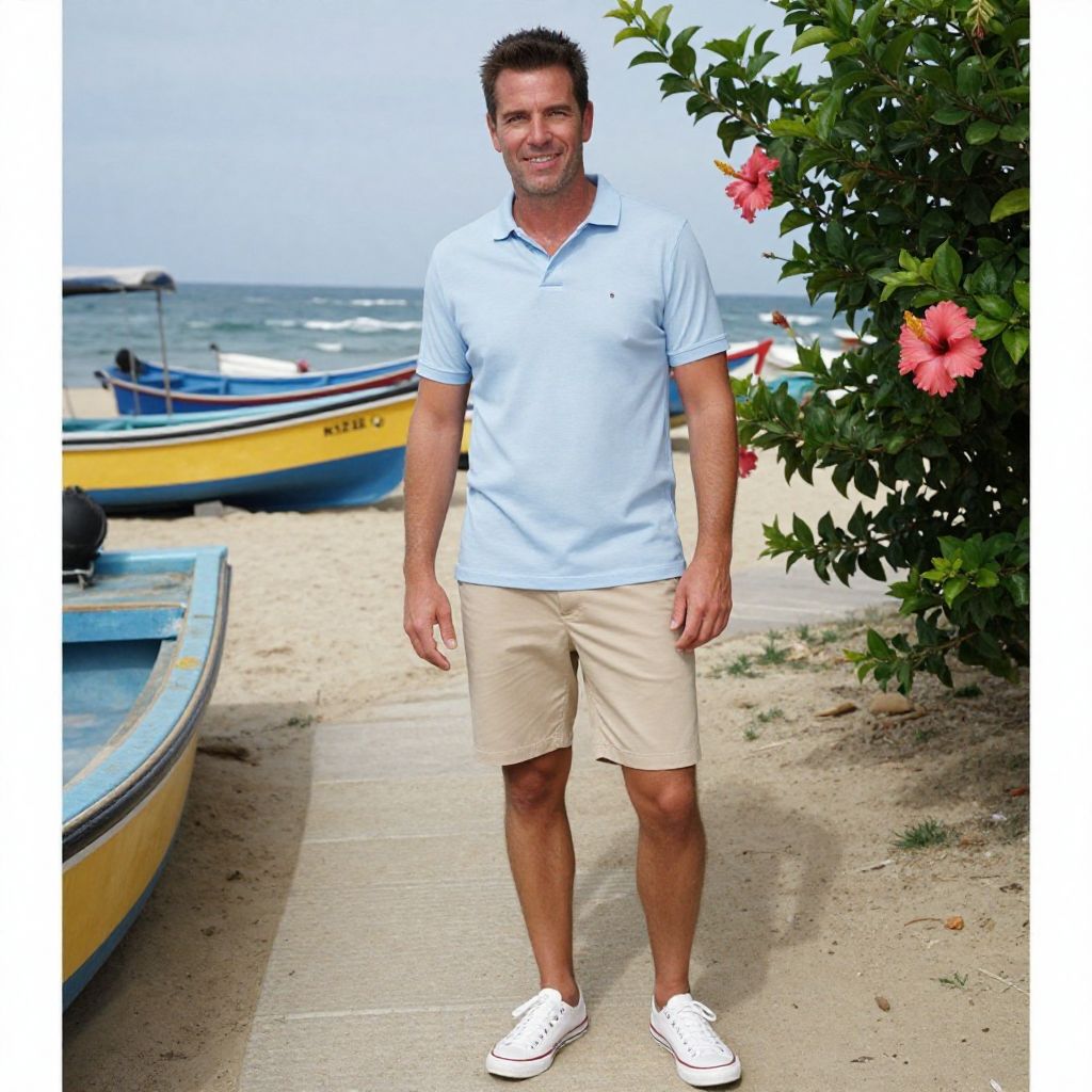 A man, light blue cotton polo shirt, beige chino shorts, white canvas sneakers, casual beach vibe, colorful fishing boats, sandy pathways, blooming hibiscus flowers, kodak sp analog photo, relaxed smile, sun-kissed skin. Man has masculine face and piercing eyes