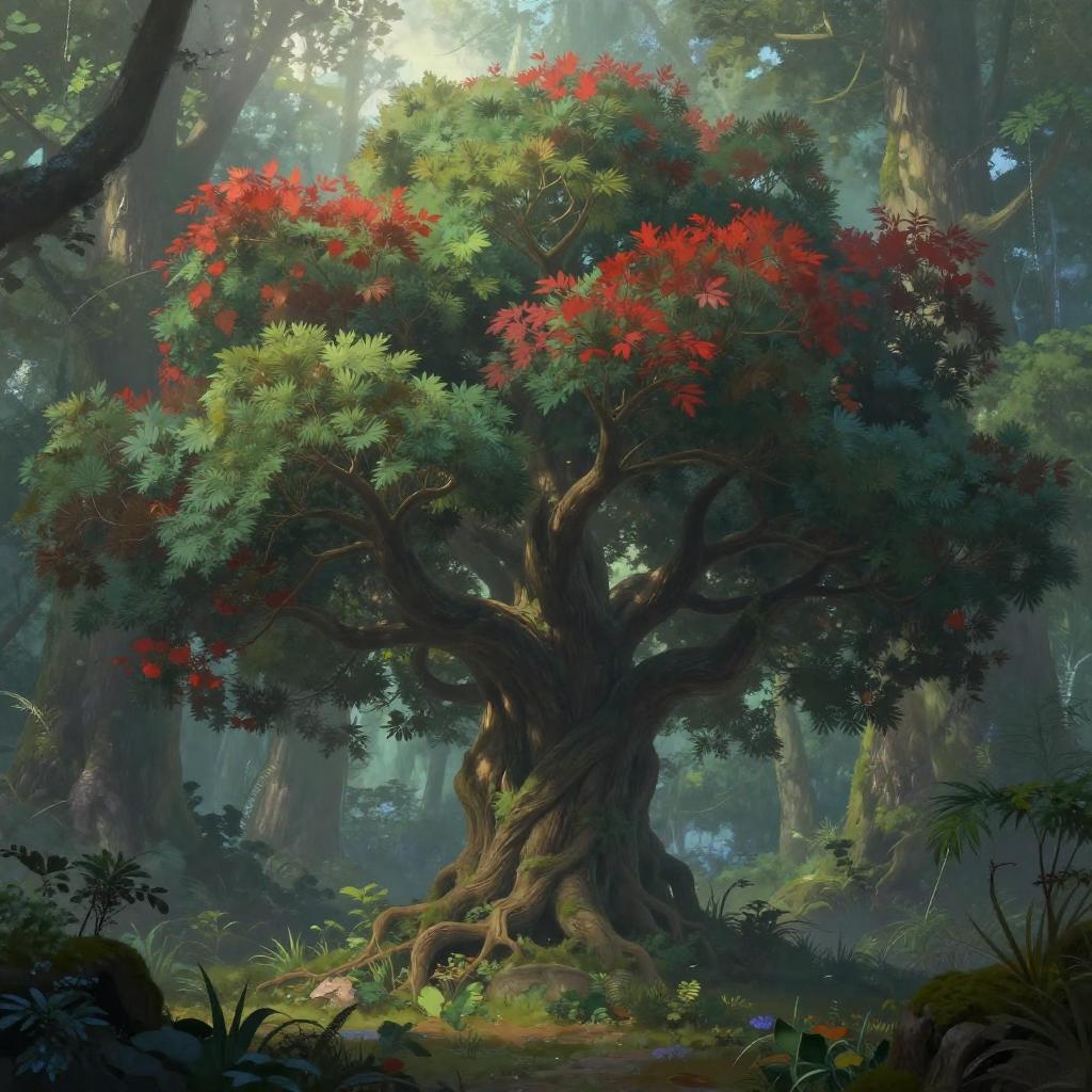 A vibrant, mystical forest scene featuring an ancient tree with multi-colored foliage under a radiant double rainbow. The forest floor is illuminated with ethereal light beams and lush moss, with a solitary animal standing in the foreground. The atmosphere is dreamlike and magical.