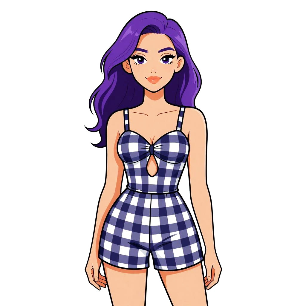 Woman with pretty face and pretty hair. Woman, casual summer, spaghetti-strap checkered midi dress in light blue and white, square neckline, slit on one side, silver strappy sandals, white studio background --sref 1467